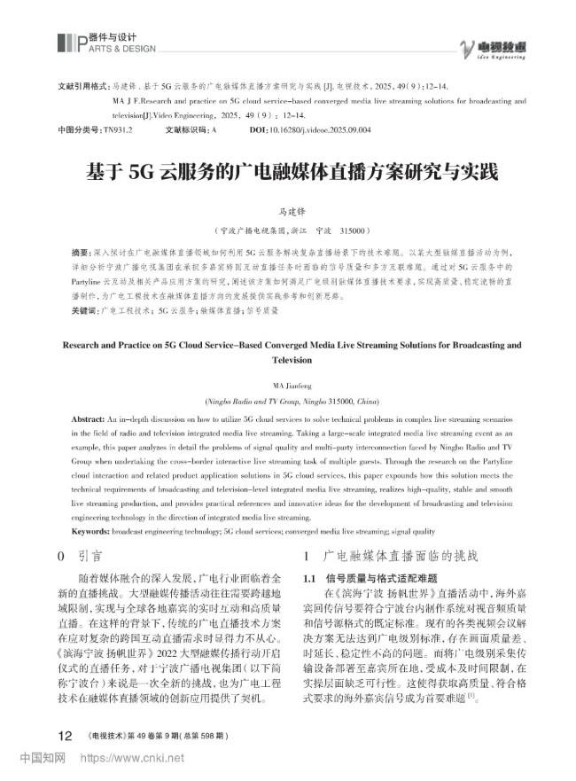 宁波广播电视集团马建锋在《电视技术》2025年第9期发表的论文《基于5G云服务的广电融媒体直播方案研究与实践》,聚焦广电行业在融媒体直播领域的创新探索。论文以宁波广播电视集团承担《滨海宁波 扬帆世界》大型融媒传播行动的跨国直播任务为案例,深入分析了信号质量、多方互联与系统部署等核心技术挑战。