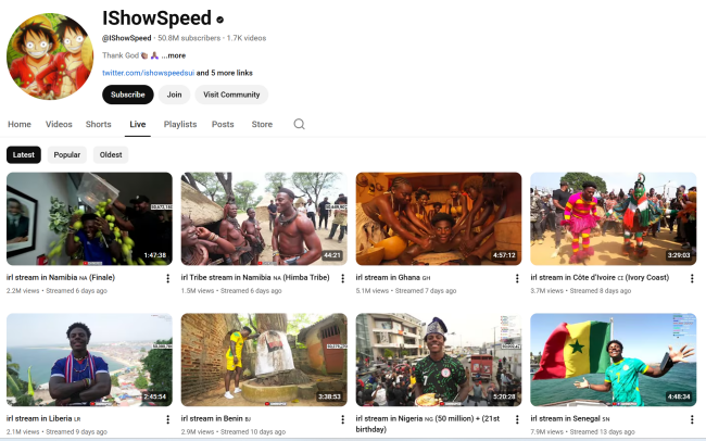 2025年12月29日,YouTube超级网红IShowSpeed(”甲亢哥”)正式启动了”Speed Does Africa”项目——一场横跨非洲大陆的28天、20国不间断直播之旅。他从安哥拉出发,途经南非、肯尼亚、埃塞俄比亚、埃及、摩洛哥、尼日利亚、加纳等国,于2026年1月27日在纳米比亚圆满收官。整个巡演累计全球观看量突破1.2亿次,单场峰值同时在线观看人数超过25万,IShowSpeed更在尼日利亚突破5000万YouTube订阅者的里程碑。这场现象级巡演不仅是内容创作的重大突破,更是大规模跨国移动直播技术的一次极限考验。